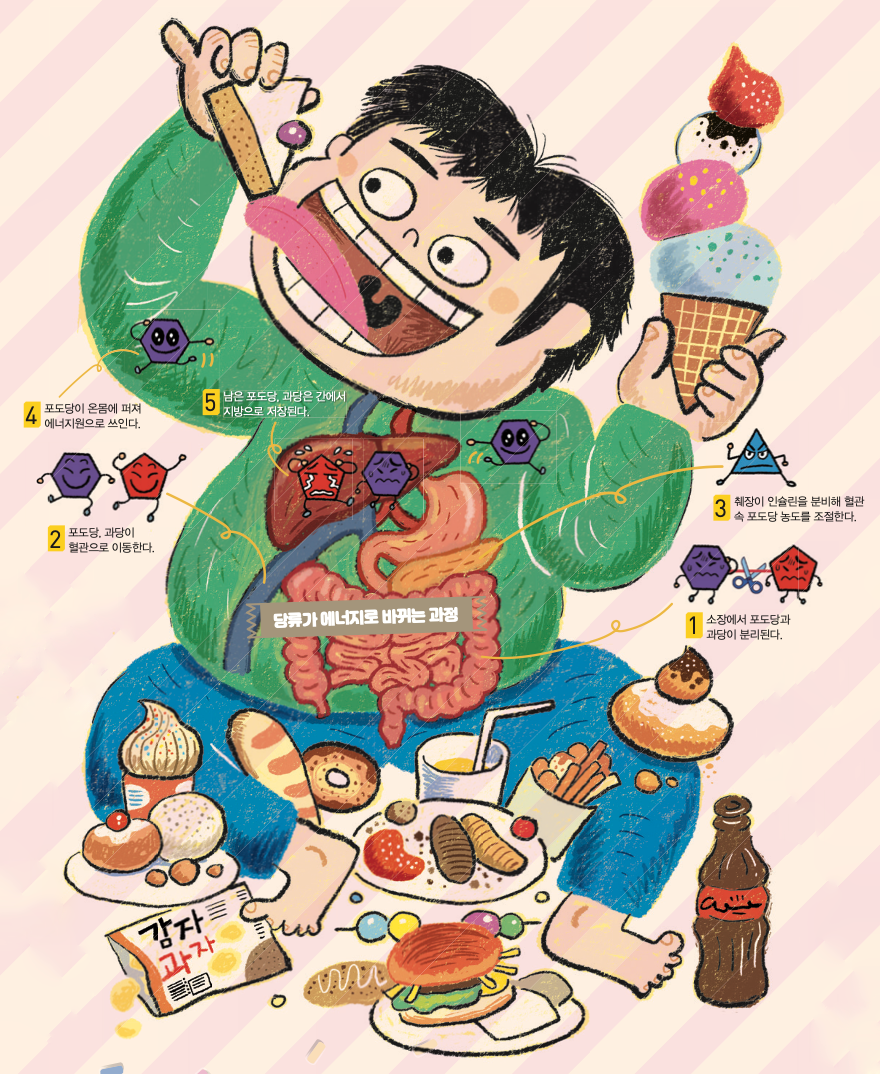 몸속에 들어온 설탕은 소화기관을 지나면서 포도당과 과당으로 분해된 후, 소장에서 흡수돼요. 흡수된 포도당의 일부는 간과 근육에 글리코겐의 형태로 저장되어 에너지원으로 쓰여요. 남은 포도당과 과당은 혈관으로 퍼집니다. 혈액 속에 포도당과 과당이 많아질수록 혈액 속 당류, 즉 혈당이 올라가요. 랜식 양혁용 대표는 “어린이는 체중이 가볍고 소화가 빨라 성인과 같은 양의 당류를 섭취해도 혈당 변화가 크다”고 설명했어요.