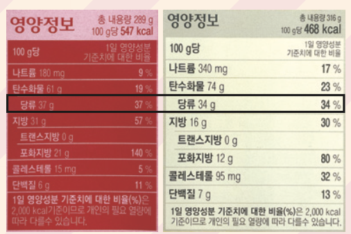 그런데 어린이들의 노력만으로는 가공식품을 통한 당류 섭취를 줄이기 쉽지 않아요. 어린이들은 가공식품 속 당류에 노출되기 쉬운 환경에 놓여 있거든요. 서울시 보건환경연구원에 따르면, 어린이와 청소년이 편의점에서 자주 구매하는 콜라 한 캔과 초코우유 한 팩에는 당류가 각각 32g, 21g 들어 있어요. 콜라 2캔, 초코우유 3팩만 마셔도 어린이와 청소년의 하루 권장 당류 섭취량인 45~50g을 넘는 거예요.