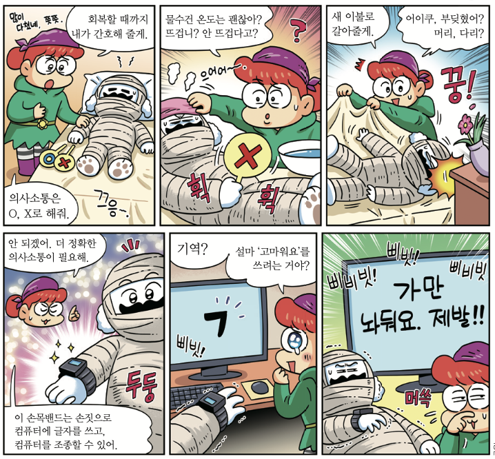 7월 23일, 미국의 기술 기업인 메타의 연구팀은 손짓으로 컴퓨터에 글자를 입력하는 손목밴드를 개발해 공개했어요. 손목밴드는 전기 근전도로 근육이 움직일 때 발생하는 전기 신호를 측정하고, 전기 신호를 컴퓨터 명령으로 바꿀 수 있어요. 그리고 무선통신 방식인 블루투스를 이용해 컴퓨터와 연결돼 글자를 입력하죠. 연구팀은 사용자 20명에게 손목밴드를 차고 필기를 시킨 결과, 컴퓨터에 분당 평균 20.9 단어가 입력될 수 있었어요. 연구팀은 “손목밴드를 이용하면 근육이 약하거나 손가락을 못 움직이는 사람도 컴퓨터를 사용할 수 있을 것”이라고 기대했답니다.