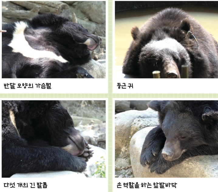 반달가슴곰은 온몸이 검은색이며 앞가슴에 있는 하얀색 반달 무늬가 특징이에요. 몸길이가 1.5~2m 정도이며, 몸무게는 100kg이 넘어요. 장이권 교수는 “야생동물끼리 마주칠 때, 반달 무늬를 보여줘 크기를 드러내기 위해 반달 무늬가 발달했을 것”이라고 말했어요.
