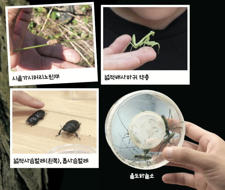 반달가슴곰 관찰이 끝나고 대원들은 지리산국립공원을 벗어나 계곡물이 흐르는 산책로로 야외 탐사에 나섰어요. 곤충을 연구하는 이디엘 연구원과 원정운 연구원은 생물 채집 방법인 ‘스위핑’을 알려 주었어요. 스위핑은 포충망을 일정하게 흔들면서 풀숲을 훑는 방법이에요. 대원들은 스위핑으로 시골가시허리노린재 등을 채집했어요. 코알라탐험대 팀 이연재 대원은 “포충망을 풀밭에서 흔들었을 뿐인데, 평소 곤충을 채집하러 뛰어다녔을 때보다 더 많은 생물을 발견했다”고 말했어요.
