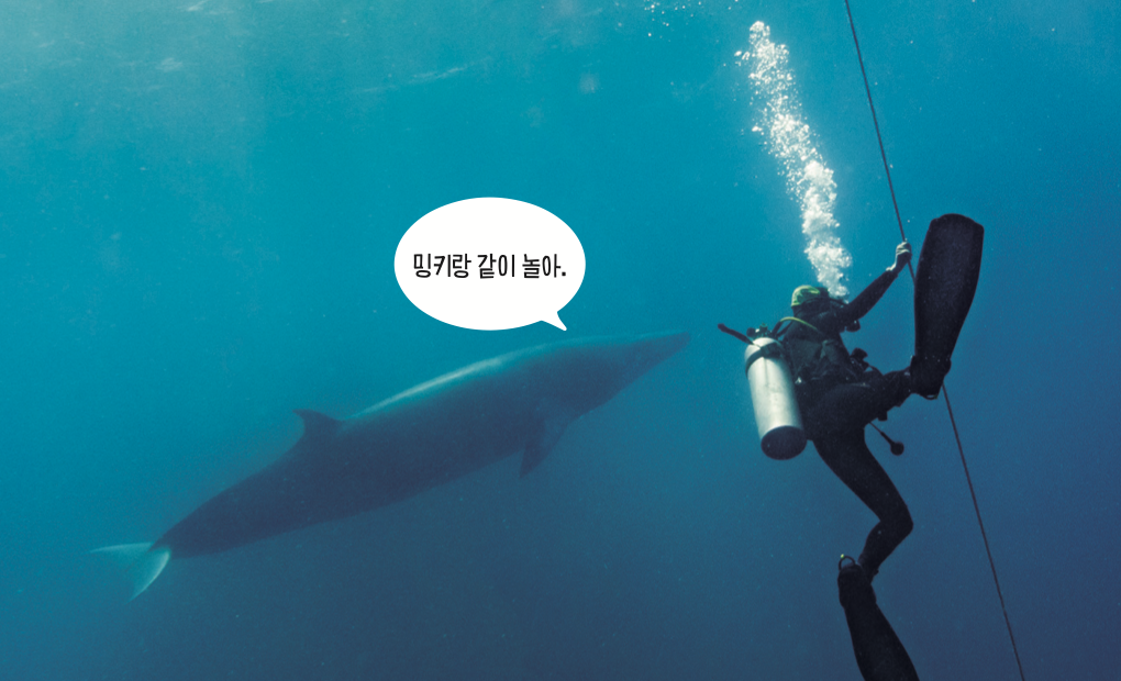 바다로 들어가 밍크고래를 보려고 사람들은 분주히 스노클과 밧줄을 챙겼어요. 사람들은 밧줄에 매달려 바닷속을 들여다봤어요. 10분이 지나고 배로 돌아가려는 순간 수심 7m쯤에서 밍크고래가 눈앞으로 왔다가 사라지기를 반복했어요.