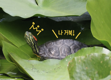 경북대학교 연못에서 이원재 연구원이 손바닥만 한 새끼 붉은귀거북을 발견했어요. 슬금슬금 다가갈 때까지 움직이지 않던 새끼 붉은귀거북은 더 가까워지자 물속으로 풍덩 빠졌습니다. “방금 본 거북의 FID는 무엇이냐”는 대원들의 질문에 이원재 연구원은 “1m 정도”라고 답했습니다.