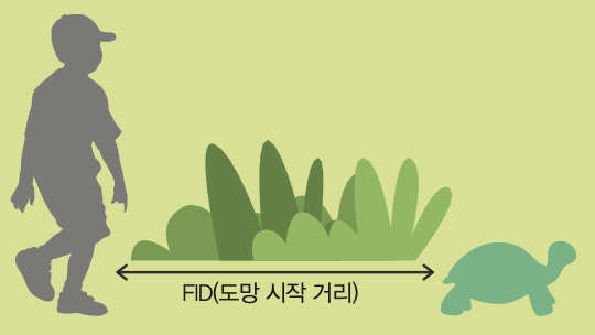 FID는 ‘Flight Initiation Distance(도망 시작 거리)’를 줄인 말이에요. 사람이 다가올 때 거북이 피하기 시작하는 거리를 의미하지요. FID는 사람이 거북에게 접근하는 정도와 거북이 사람에게 익숙한 정도에 따라 달라져요. 사람이 자주 오는 연못에 살아 사람과 친숙한 거북일수록 FID가 짧고, 사람이 잘 오지 않는 연못에 살거나 사람을 낯설고 위험하게 느끼는 거북일수록 FID가 길어요. 이원재 연구원은 “FID가 너무 길어도 거북이 극단적으로 예민함을 느끼는 거고, 너무 짧아도 지나치게 편안함을 느끼는 것이라서 거북의 행동에 문제가 생긴 것”이라고 밝혔어요.