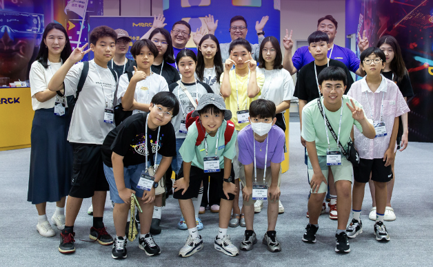 올해 이 캠프가 5회를 맞이해 서울 코엑스에서 진행된 한국디스플레이산업전시회(K-Display)에서 다양한 기업에서 만든 디스플레이를 보기로 했어요. 세 개의 전시관을 견학했지요. 머크 사(Merck)와 삼성 디스플레이, LG 디스플레이였어요. 세 전시관 모두 세계적으로 손꼽히는 디스플레이 기업으로, 한국정보디스플레이학회가 어린이들에게 미래 디스플레이 기술을 보여주고 싶어 특별히 고른 곳이랍니다.