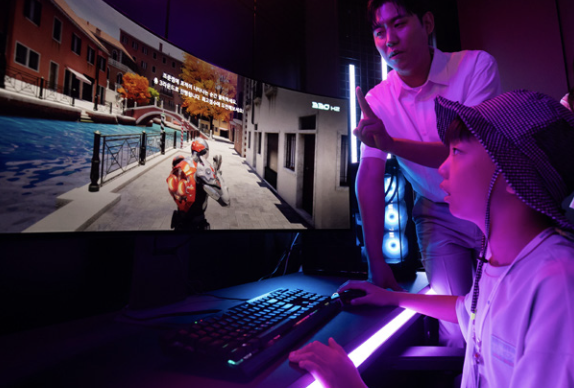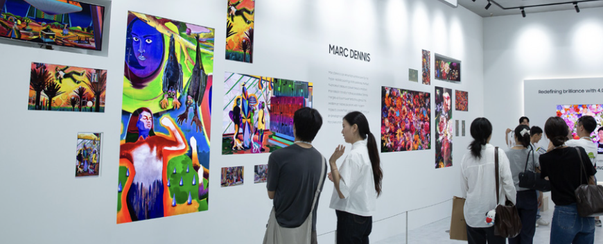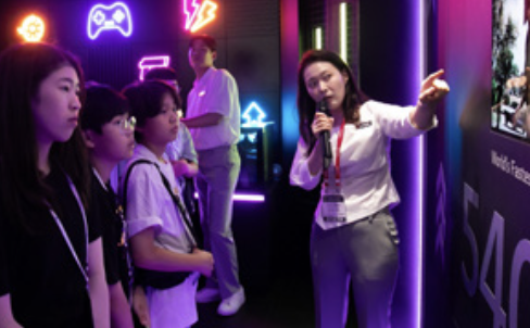 어린이 기자단은 삼성 디스플레이 전시관 한쪽 벽면을 가득 채운 예술 작품을 보았어요. 이집트 작가 바심 마그디와 미국 작가 마크 데니스의 작품으로, 강렬한 색채가 돋보였지요. 삼성 디스플레이 관계자는 “이렇게 강한 색감을 쓰는 예술 작품을 화면으로 보여주려면 밝고 어두운색의 구분이 뚜렷해야 하기 때문에 유기발광다이오드(OLED)를 사용한다”고 말했어요.