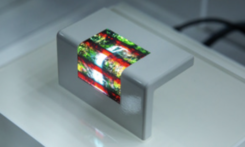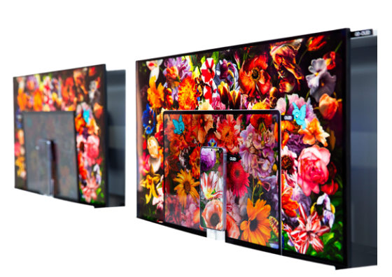 그 옆 벽면에는 OLED가 쓰인 스마트폰과 태블릿 PC, 양자점 OLED(QD-OLED) 잉크가 발린 노트북이 겹쳐 있었어요. 양자점은 지름이 수 nm● 정도인 초미세 반도체 입자예요. QD-OLED는 OLED 층이 청색 빛을 만들고, 그 빛이 양자점 잉크를 통과하면 적색 또는 녹색, 특정 색이 나오는 원리를 이용한 거예요.