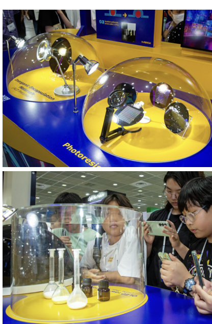 그다음으로 어린이 기자단은 머크 사 전시관에 갔어요. 이곳에는 하얀 분말 소재가 들어 있는 병이 놓여 있었지요. 이 소재는 디스플레이의 기본 재료가 되는 ‘액정 물질’이에요. 물질의 상태는 고체, 액체, 기체 외에도 액정상이라는 특별한 상태가 있어요. 액정상은 고체와 액체의 중간 성질을 가진 상태로, 고체처럼 분자가 규칙적으로 배열되고, 액체처럼 흐를 수 있어요. 이를 액정 물질이라고 해요. 액정 물질을 디스플레이에 넣으면, 우리가 기기의 화면을 볼 수 있어요.