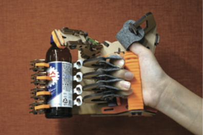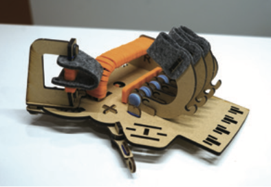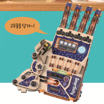 오늘은 고무줄을 당겨 손가락을 움직이는 로봇 손을 만들어 볼 거예요. 이때 로봇 손의 나무 프레임은 뼈, 고무줄은 인대에 해당해요. 먼저 손가락과 손바닥 프레임을 순서에 따라 조립하고, 고무줄로 연결하면 로봇 손이 완성돼요. 손에 로봇 손을 끼워 보면, 손가락으로 물건을 집을 수 있는 로봇 손 완성!