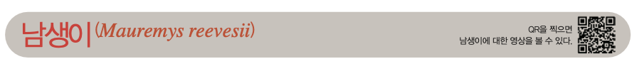 남생이는 몸 옆면에 노란 줄무늬가 있어요. 다 자란 성체의 등딱지 크기는 25~45cm 정도로, 세로로 산처럼 솟은 세 개의 융기선이 특징이죠. 남생이는 물과 육지를 오가면서 수초 뿌리와 곤충, 작은 물고기 등을 먹고 살아요. 일광욕을 좋아해 연못과 하천 가장자리 돌 위에 올라가 햇볕을 쬐곤 해요.