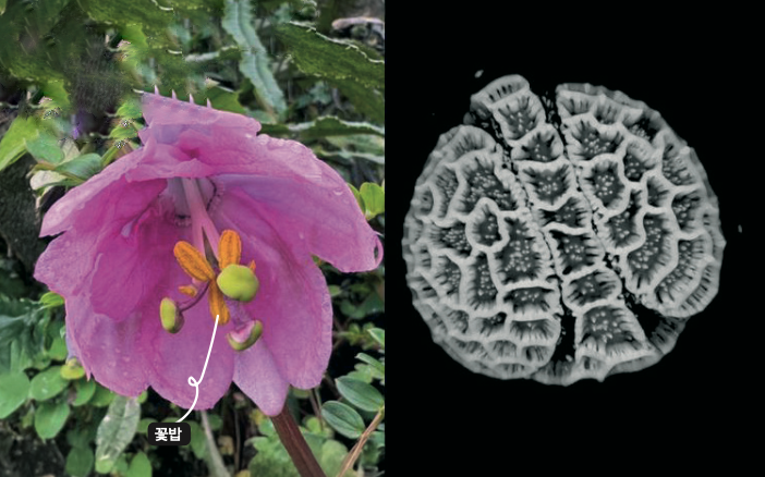 ‘Passiflora cumbalensis’ 꽃(왼쪽)과 현미경으로 찍은 이 꽃의 꽃가루 알갱이 사진.