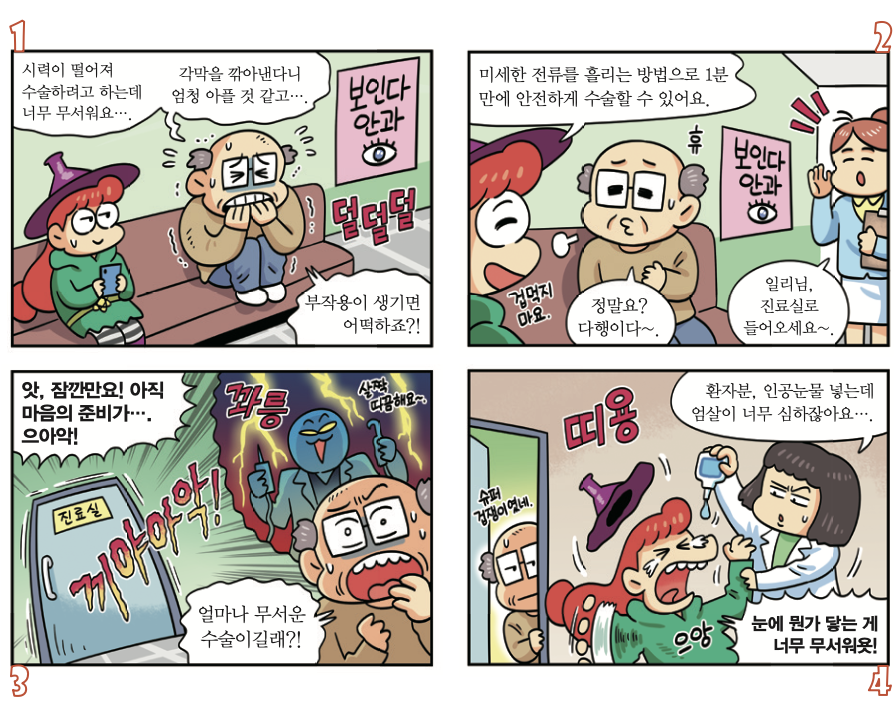 우리 눈에서 빛을 받아들이는 각막은 원래 둥근 모양이에요. 이 둥근 모양이 훼손되면 빛의 초점이 맞지 않아 원시나 근시 등 시력 문제가 생기죠. 시력 교정 수술은 레이저로 각막을 깎아 둥글게 만들어요. 각막엔 통증을 느끼는 신경이 촘촘히 밀집돼 있기 때문에, 각막을 깎는 수술 후엔 통증과 부작용이 따를 수 있어요. 또 각막이 얇으면 수술이 불가능하죠.