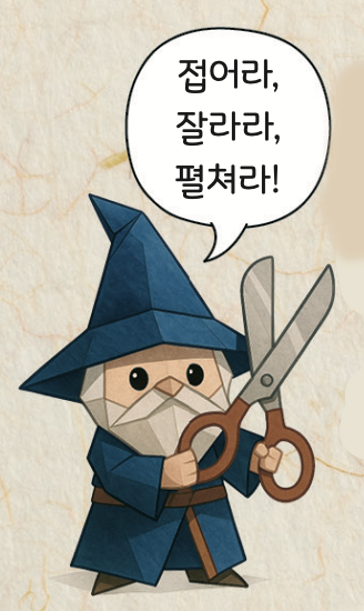 자네도 종이접기 마스터가 되고 싶나?! ‘오려오려 시험’과 ‘접어접어 시험’을 모두 통과하고, 비밀 암호를 알면 마스터가 될 수 있다네.