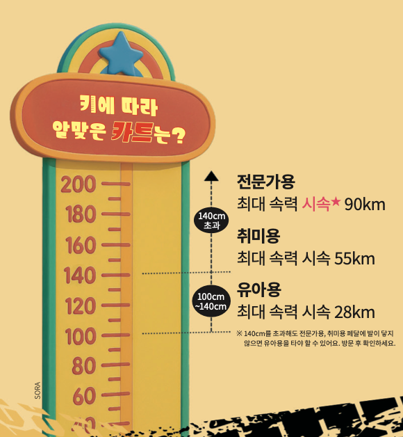 단, 카트를 운전하려면 조건이 있어! 키가 100cm 이상이어야 하지. 앉았을 때 발이 카트의 페달에 안전하게 닿아야 하거든.