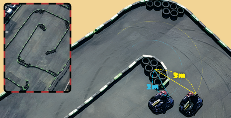 카트를 빨리 운전하려면 더 짧은 길을 아는 게 중요해! 같은 트랙이라도 안쪽 길 인지, 바깥쪽 길 인지에 따라 거리가 달라. 예를 들어 반원 모양으로 트랙을 돌 때, 중심에서 2m 떨어진 안쪽 길 은 약 6.3m를 달리게 돼. 하지만 중심에서 3m 떨어진 바깥쪽 길 은 약 9.4m를 달려야 하지.