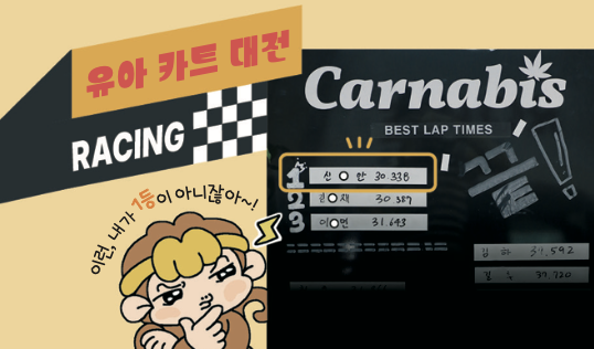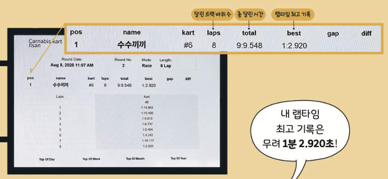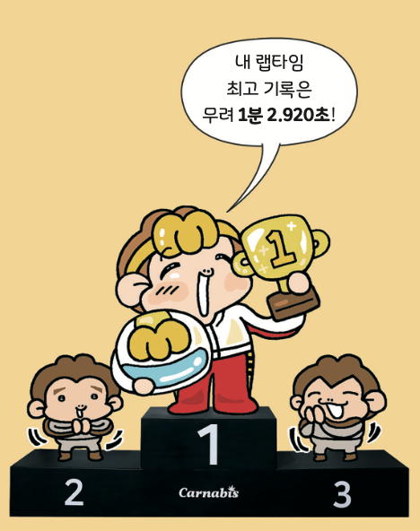 레이싱 1위는 랩타임이 가장 짧은 사람이 차지해. 랩타임이란 카트가 트랙을 한 바퀴 도는 데 걸린 시간이지. 이곳에선 랩타임을 소수점 아래 셋째 자리인 0.001초까지 측정해. 0.001초는 1초를 1000조각으로 나눈 아주 짧은 시간이야. 이 짧은 시간이 1등과 2등을 가르기도 하지!