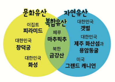 유네스코는 세계유산을 문화유산, 자연유산, 복합유산으로 나눠 선정★해요. 우리나라에서는 그동안 남한산성과 창덕궁 등이 문화유산으로, 제주 화산섬과 용암 동굴, 일부 갯벌이 자연유산으로 뽑혔어요. 지난 7월에는 울산 암각화가 새롭게 문화유산으로 뽑혔지요. 복합유산은 문화유산과 자연유산의 특징을 모두 갖고 있는 유산으로, 페루의 마추픽추가 대표적이에요.