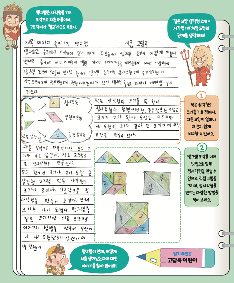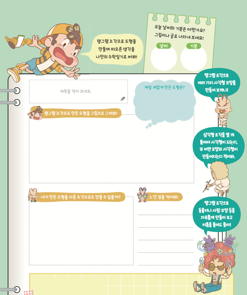 ★ 조각을 맞추는 과정을 그림과 글로 순서대로 정리하여 수학일기를 쓰도록 격려해 주세요.