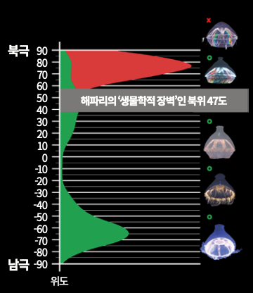 그 결과, 유전적으로 동일한 해파리임에도 혹의 유무에 따라 분포 지역이 극명하게 갈림이 드러났다. 혹이 있는 해파리는 전 세계 심해에 고르게 분포하지만, 혹이 없는 해파리는 오직 북위 47도 이북 지역에서만 발견됐다. 이러한 경계선을 ‘생물학적 장벽’이라고 한다. 물리적 장벽이 없음에도 원숭이와 유대류가 사는 구역이 구분되는 동남아시아의 ‘월리스선’이 대표적이다.