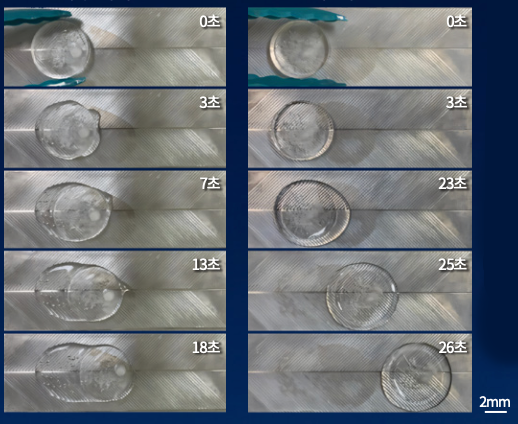 초발수 알루미늄에선 초반 얼음이 홈의 능선 부분에 부분적으로 달라붙어 움직이지 못하다가 녹은 물 안에서 발생한 표면장력 차이로 순간 얼음이 튀어나가듯 빠르게 이동했다.