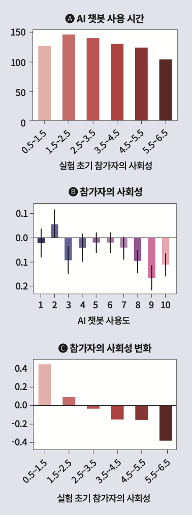 다만 실험 초반에 사회성이 낮았던 참가자 중 일부에선, AI 챗봇을 사용해서 사회적 교류가 오히려 개선된 경우도 있었다🅒.