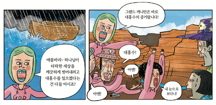 ‘과거에 일어난 사건을 증명할 수 없다’라는 입장은 증거를 통한 논리적 설득과 합의로 이뤄지는 과학의 일반적인 발전 방식을 전면으로 부정하며, 성경에 대한 절대적인 믿음이라는 렌즈를 통한 본인의 주관적인 경험만을 중요하게 여긴다. 이는 본 연재 3화에서 살펴봤던 지구평면설 지지자들의 입장과도 유사한 측면이 있다. 마치 지구평면설 지지자들이 우주에서 찍은 지구 사진에서 조작과 은폐의 흔적을 ‘알아보는’ 것처럼, 창조과학 지지자들은 지층과 화석에서 창조와 홍수의 흔적을 ‘알아본다.’ 창조과학 지지자들에게 진화의 증거를 아무리 들이밀어도 소용없는 것은 이런 이유 때문이 아닐까?