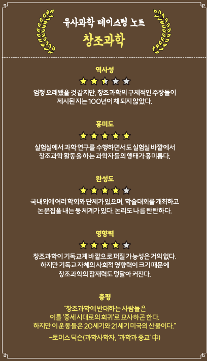진화론 삭제 청원은 생물학계를 비롯한 과학계의 반발로 무산됐지만, 이 사건은 유사과학을 대학원 연구 주제로 잡고 구체적인 사례를 탐색하던 필자의 호기심을 자극했다. 창조과학이 다른 유사과학과 다른 점은 그 체계성과 영향력에 있다. 진화론 삭제 청원을 넣은 교진추, 그리고 그 배후에 있는 ‘한국창조과학회’는 창조과학을 지지하는 이공계 학자들이 모인 단체들이다. 이들 중 상당수는 이공계에서 박사 학위를 받고 대학이나 연구소 등에서 연구 활동을 하고 있다.