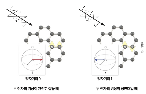 두 전자(A, B)의 위상이 왼쪽 그림처럼 같으면 양자거리가 0(빨간색 화살표), 위상이 오른쪽 그림처럼 정반대면 1(파란색 화살표)로 나타낸다.