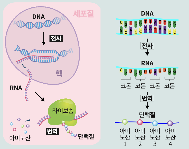 DNA에서 RNA로의 정보 전달은 뉴클레오타이드라는 동일한 물질 단위와 염기서열이라는 같은 정보 체계를 이용합니다. 그러나 RNA에 저장된 정보가 단백질로 전환될 때는 아미노산이라는 전혀 다른 물질이 사용되며, 염기서열이 아미노산 서열로 전환됩니다. 이와 같은 과정은 RNA의 염기 정보라는 하나의 ‘언어’가 단백질의 아미노산 서열이라는 또 다른 ‘언어’로 바뀌는 것과 같으므로 ‘번역(translation)’이라고 부릅니다.