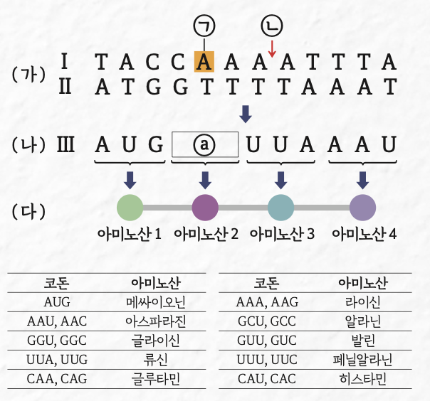 (6) ㉡ 부분에 염기 A가 1개 삽입되는 돌연변이가 일어나면 아미노산 3은 류신에서 페닐알라닌으로, 아미노산 4는 아스파라진에서 라이신으로 바뀐다.